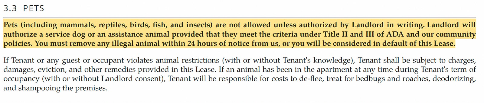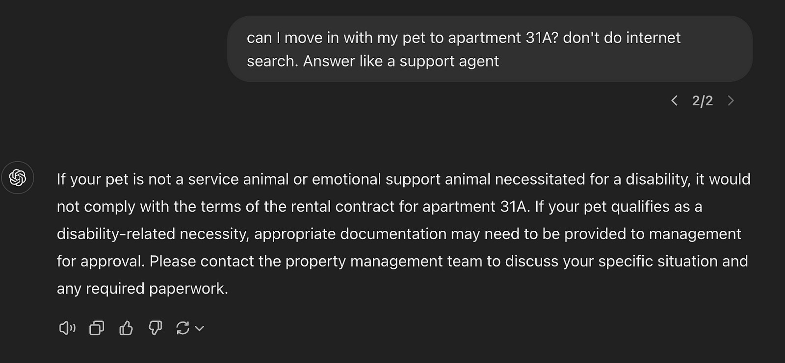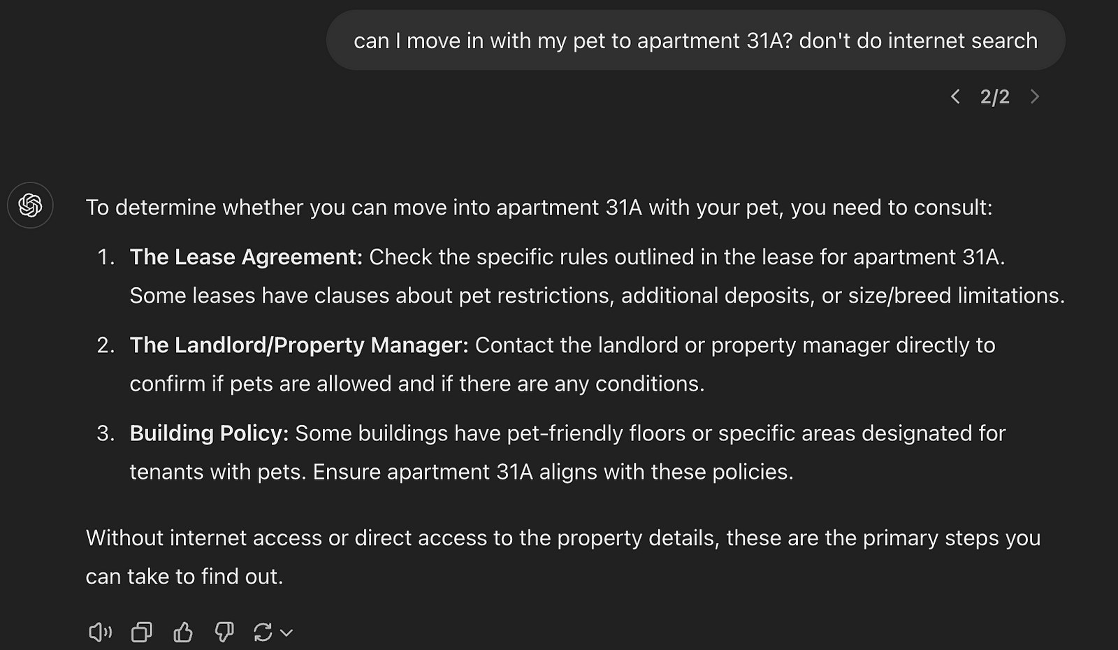 So what happens if I ask the same question while pasting the plain text of the rental lease pets section? I first pasted the relevant page from my rental contract and then asked my question. Magic ensues.
