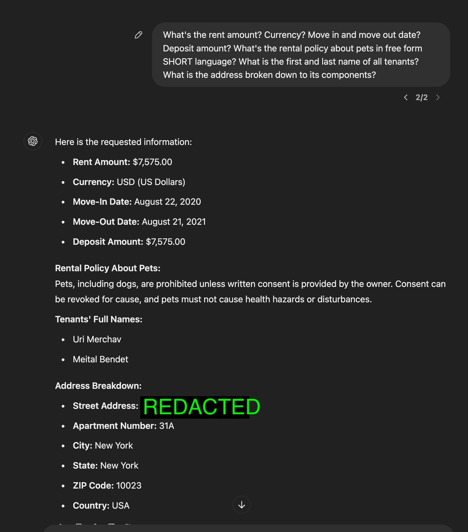 Let’s walk through a concrete example. I can copy and paste my entire rental lease (all 53 pages of it) and prompt GPT to extract the fields I’m interested in.