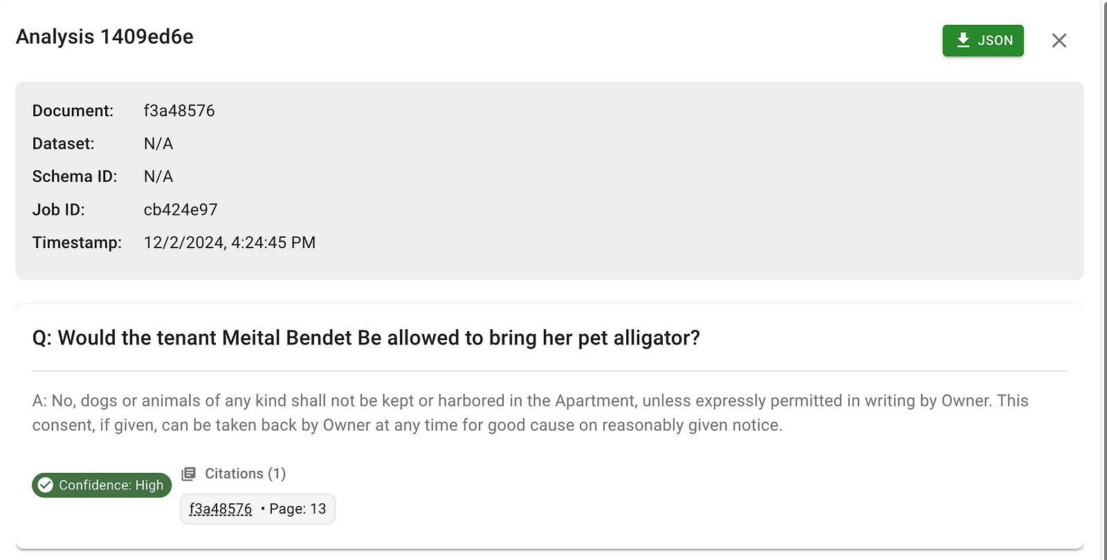 This question triggers a chain where the AI introspects about what fields we have in our schema, (e.g. renter names, pets allowed which is a true/false boolean, Pets Allowed Details which is a short text span). The AI then writes a DB query to fetch the relevant result, read through the records that are returned (e.g. renter name == “Meital Bendet”), and the finally reason about the result, potentially referring to the raw document text as needed.
